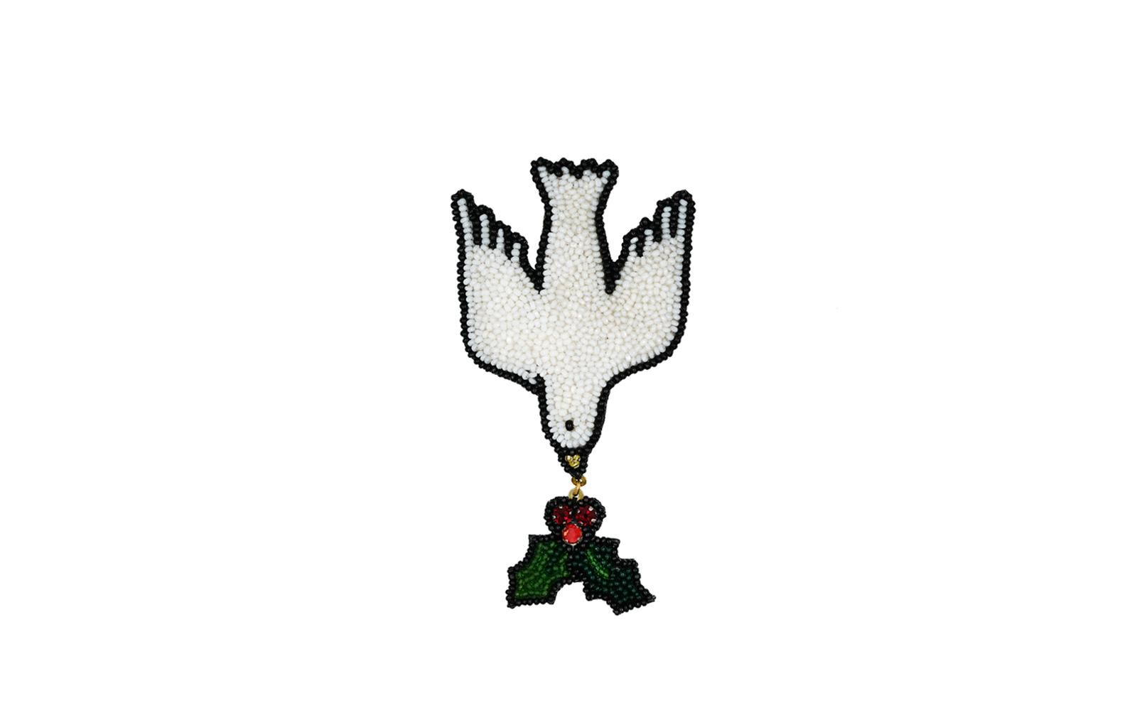 プレゼントのヒイラギを咥えた姿が愛らしい冬季限定「プレゼントシリーズ」ハトのブローチ。 真下に向けても、少し斜めにつけて躍動感を出すことも出来ます。 体の白ビーズはカットが入っておりキラリと輝きます。