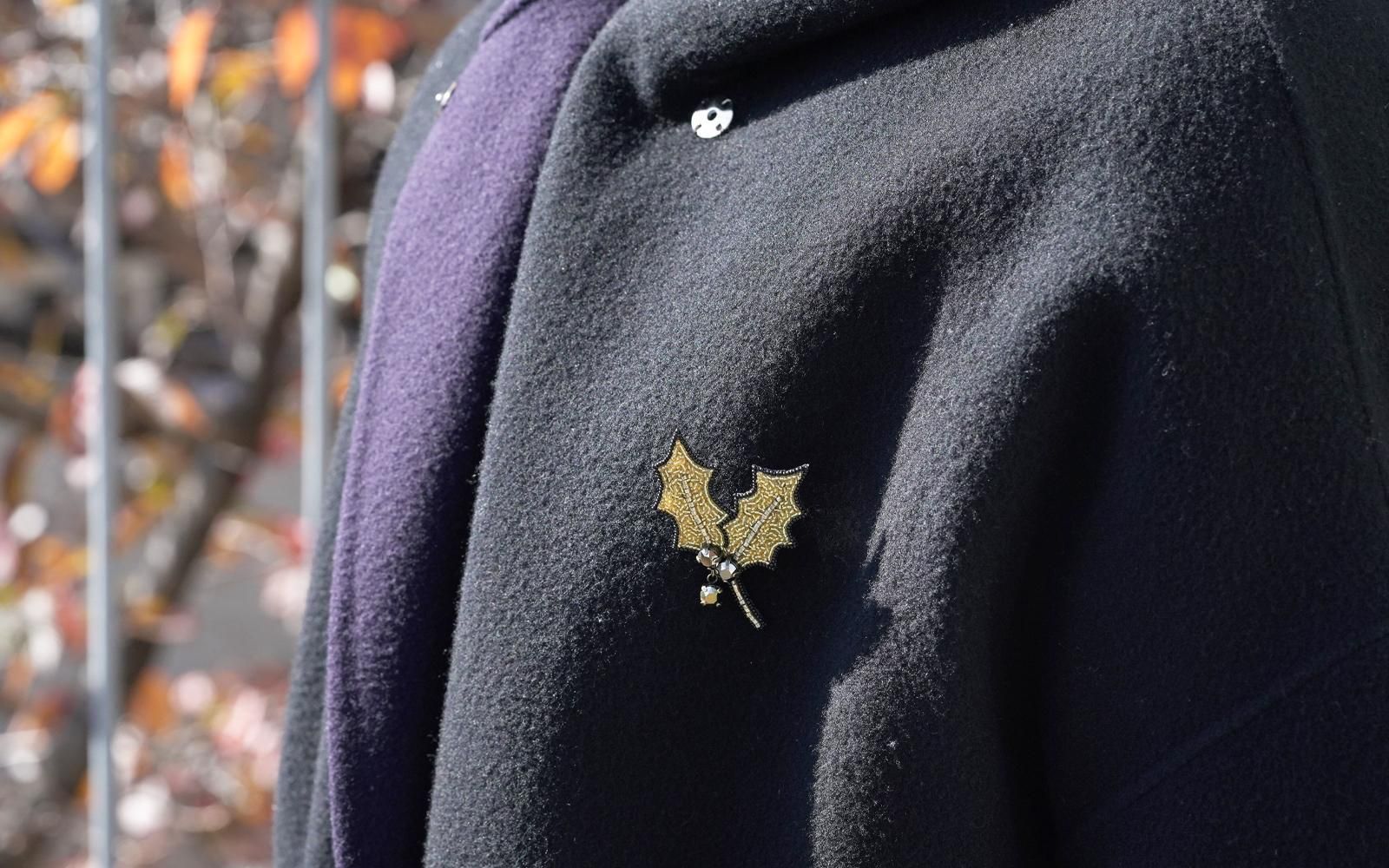 冬季店頭限定だった「ヒイラギ」ブローチです。 キラッと輝く葉っぱとスワロフスキーが冬のコーディネートのポイントとなります。