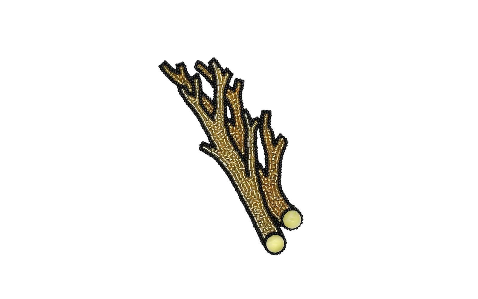2024年12月ギャラリードゥポワソンで行われた Môko Kobayashi Exhibition『N’ existe pas? 〜存在しない?〜』より、 実際には存在しない動植物をテーマにしたアクセサリー。 キラキラと輝くゴールドビーズで作られたブローチはコーディネートのアクセントにぴったりです。