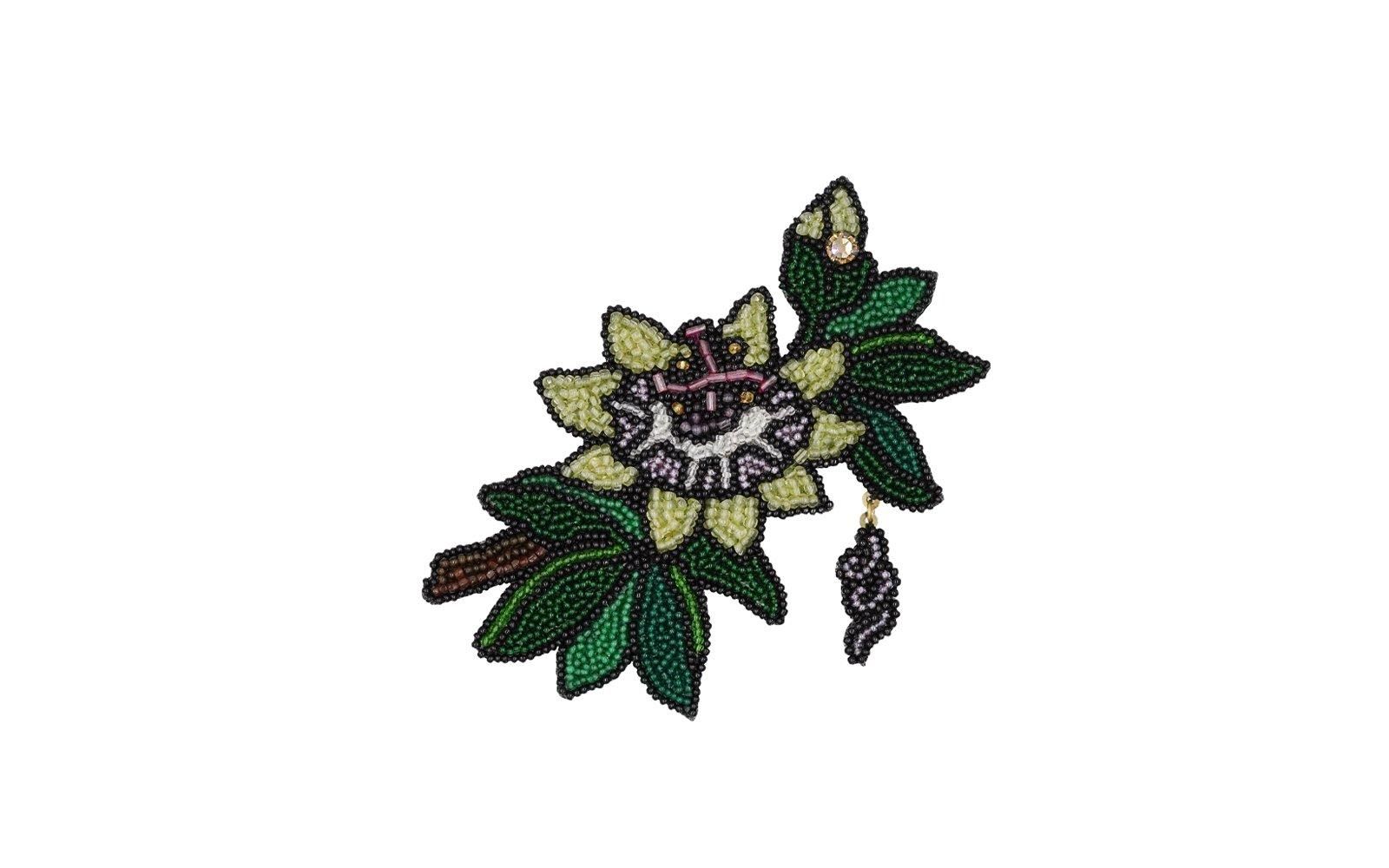 様々な色のビーズを使った「時計草」のブローチ。 くるくるとしたツルも刺繍で表現し、ゆらゆらと揺れ動きます。 また、様々なグリーンを使いわけて葉っぱを立体的に表現しています。